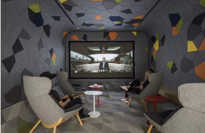 設計師將銀川辦公室設計主題定為“游樂場”,把活動空間分為三部分,展示了大多數人的成長歷程。首先以兒時玩的萬花筒為主題的VIP影院,希望從影院中看到懵懵懂懂的童年時光。