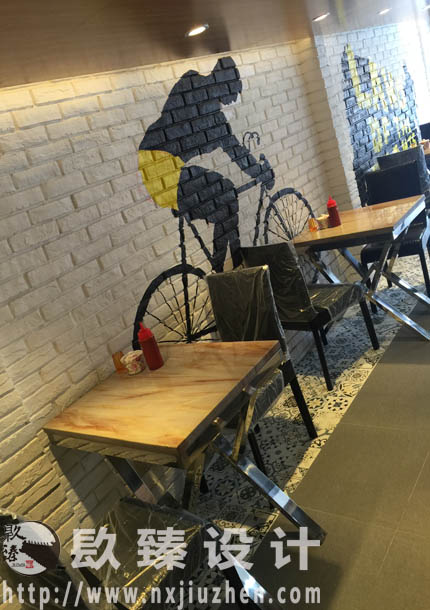 沿著獨特的樓梯,小編來到了二樓,木質桌子,黑色皮椅,白色的PK墻上手繪不同的畫,整體空間大氣又不是沉穩,簡約而不失奢華,試想一下,在這樣的地方吃飯何嘗不是一種享受。我們在追求美食的同時,可以坐下來,靜靜地觀察一下四周,想想本店的裝修風格和這種設計下給人們傳達的更深層次的意義。寧夏镹臻設計師事務所對于設計,我們是認真的!